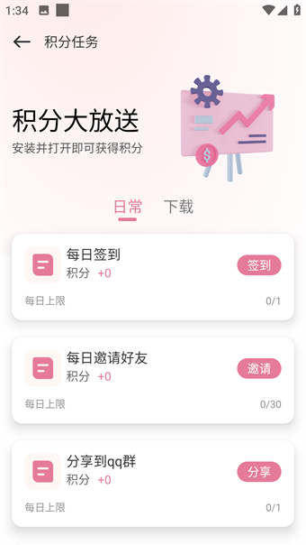 2、積分兌換回饋活動中便可以通過進(jìn)行各種任務(wù)來進(jìn)行積分的領(lǐng)到,有日常每日任務(wù)也是有下載任務(wù)。