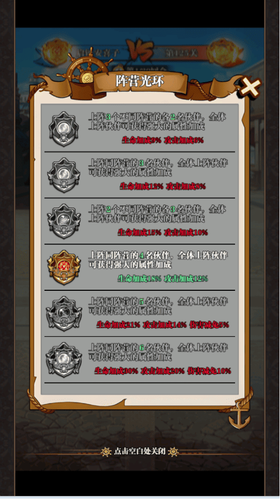 玩家需巧妙構(gòu)建戰(zhàn)斗陣容,依據(jù)不同戰(zhàn)局靈活調(diào)配角色,憑借策略與絕技征服對(duì)手,享受燒腦且激爽的戰(zhàn)斗快感。隊(duì)伍中可以編入6名角色,角色有4種陣營和4種定位。陣營分為世界政府、新星團(tuán)、大海賊、海軍和五皇;定位分為輔助、肉盾、輸出、控制。陣營之間沒有克制效果,會(huì)根據(jù)上陣中同陣營的英雄數(shù)量獲得傳說之力的加成。戰(zhàn)斗的攻擊順序是根據(jù)在布陣的站位1-6號(hào)進(jìn)行,雙方一號(hào)角色會(huì)優(yōu)先行動(dòng)以此類推,可以根據(jù)你隊(duì)伍中6名角色的定位設(shè)置合理的排陣出手順序。